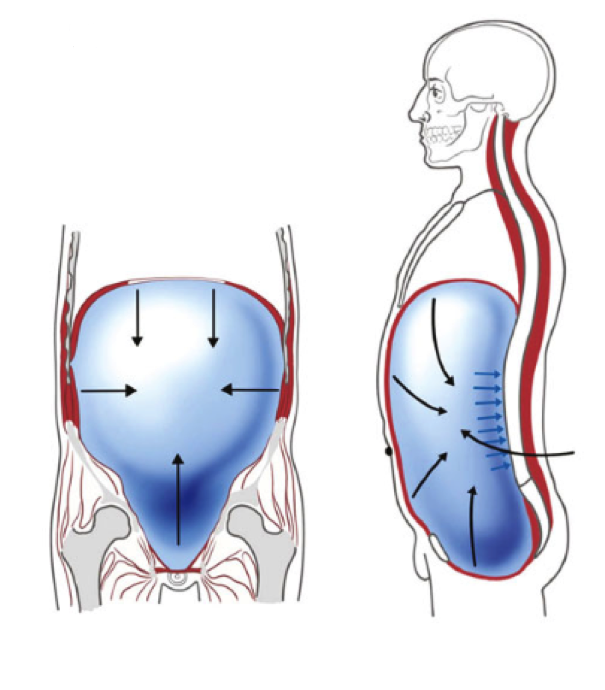 These work in unison to create pressure within the abdominal cavity. The diaphragm is responsible for exerting pressure downward, as well as expanding the volume of the pleural cavity so that air fills the lungs during inspiration. Functioning similar to a piston, the contracting diaphragm pushes the viscera down so the the pelvic floor stretches slightly. Upon exhale, the pelvic floor contracts, diaphragm relaxes, and air is forced out of the lungs. Additionally, the transverse abdominal assists the pelvic floor in creating intra-abdominal pressure during an exhale. Meanwhile the multifidus helps to keep the spine in a slightly extended position, ensuring proper function.